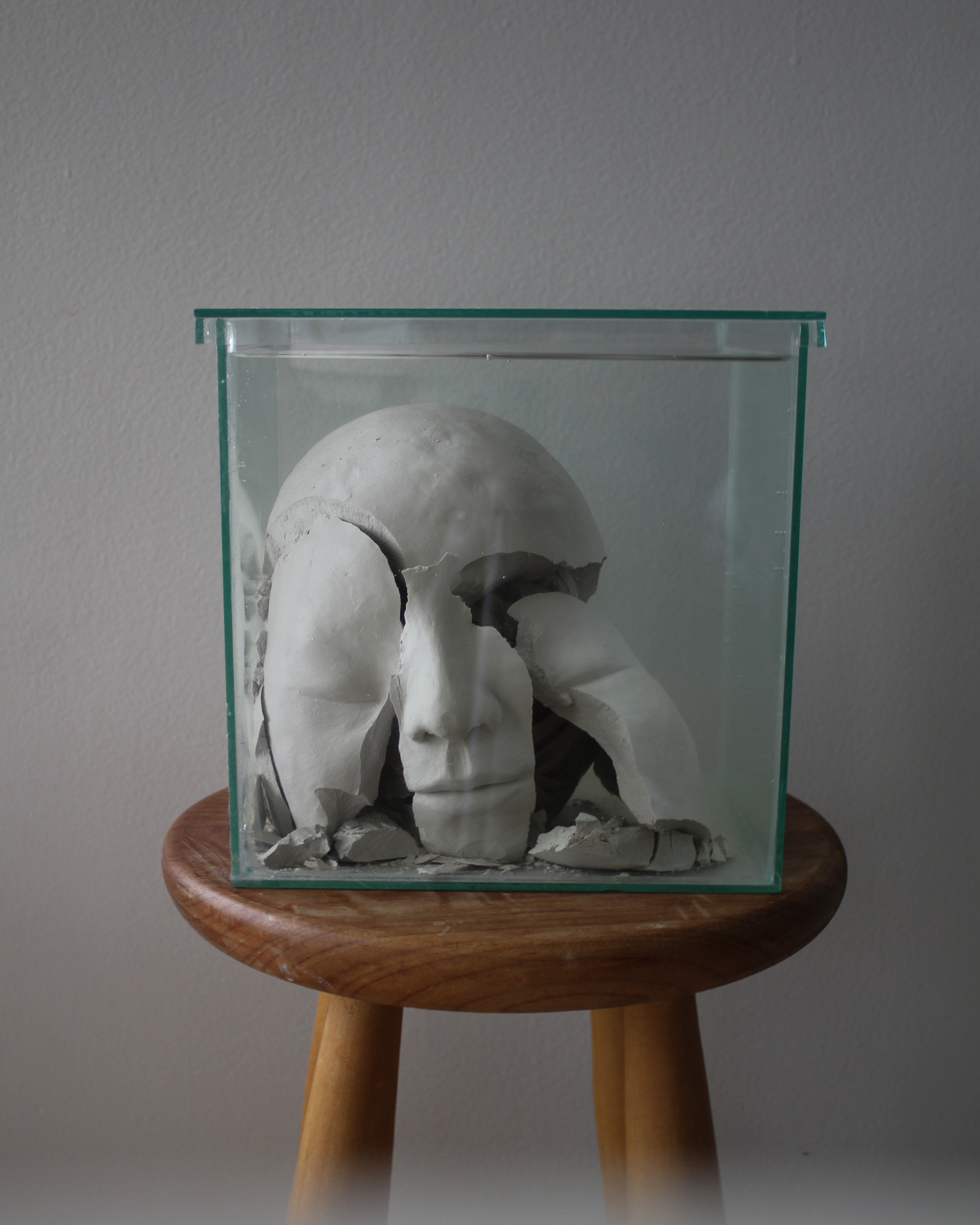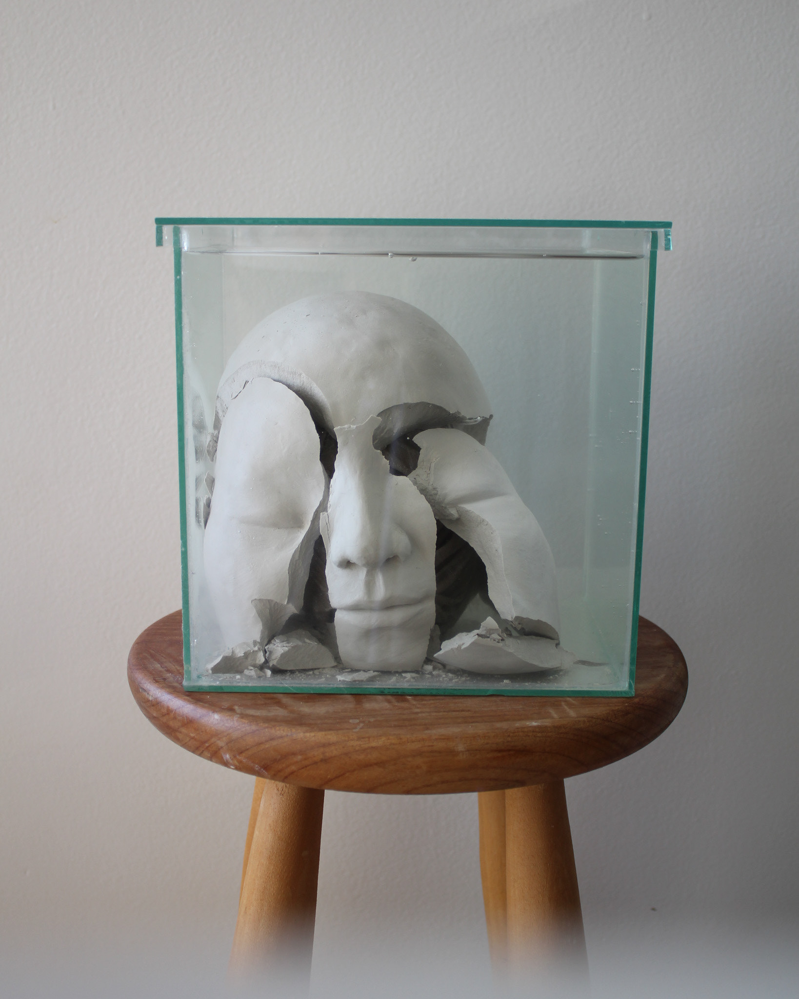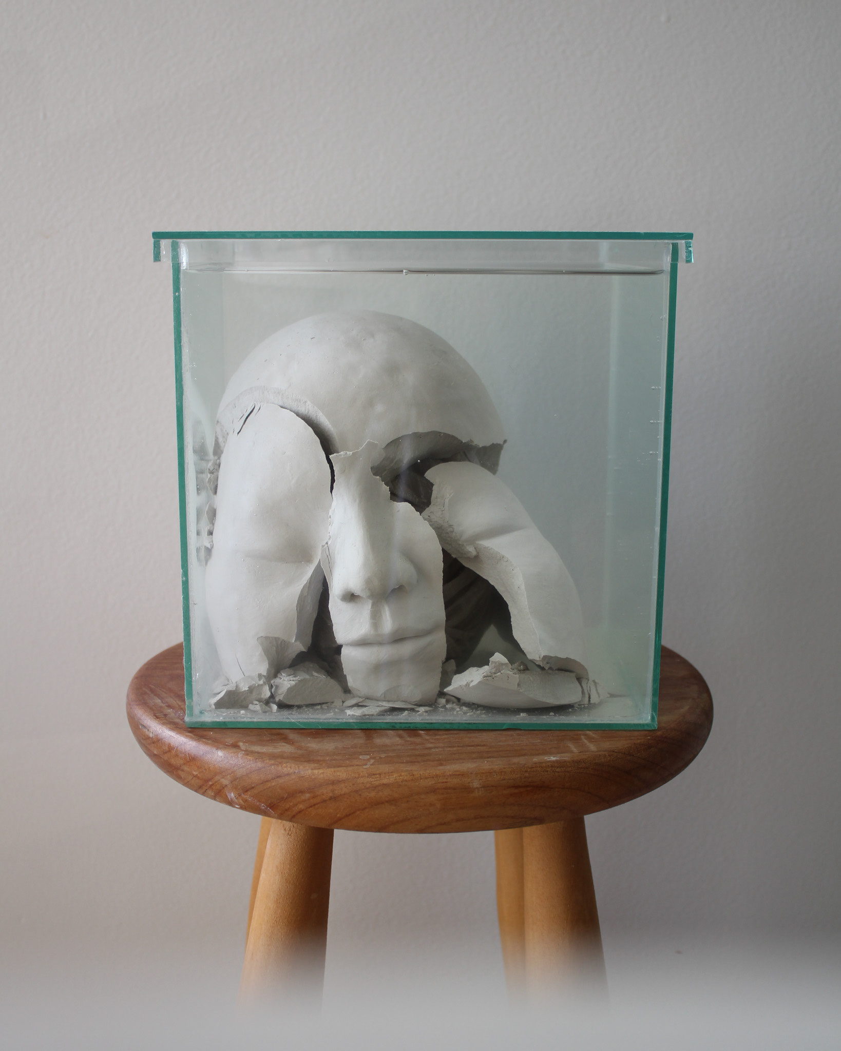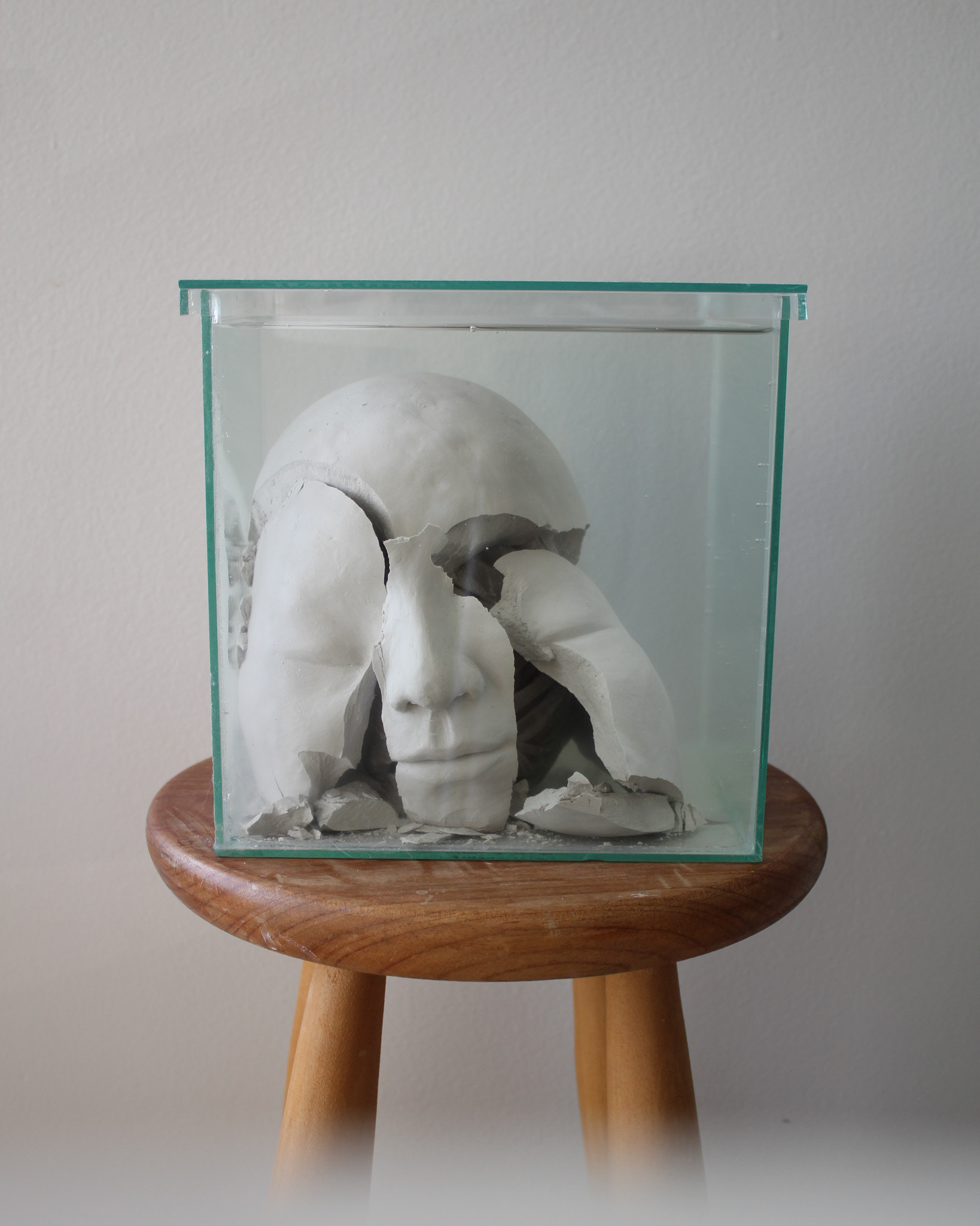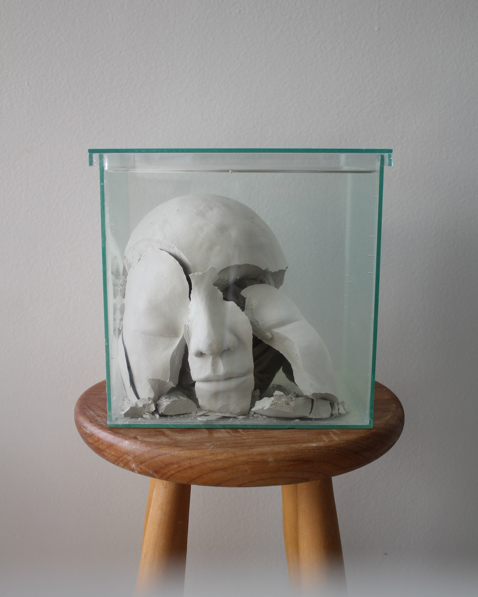Série de fotografias realizada com registro de escultura de porcelana dissolvida em água. Caixa de vidro utilizada como recipiente. Impressão sobre canvas, 110 cm, 62 cm