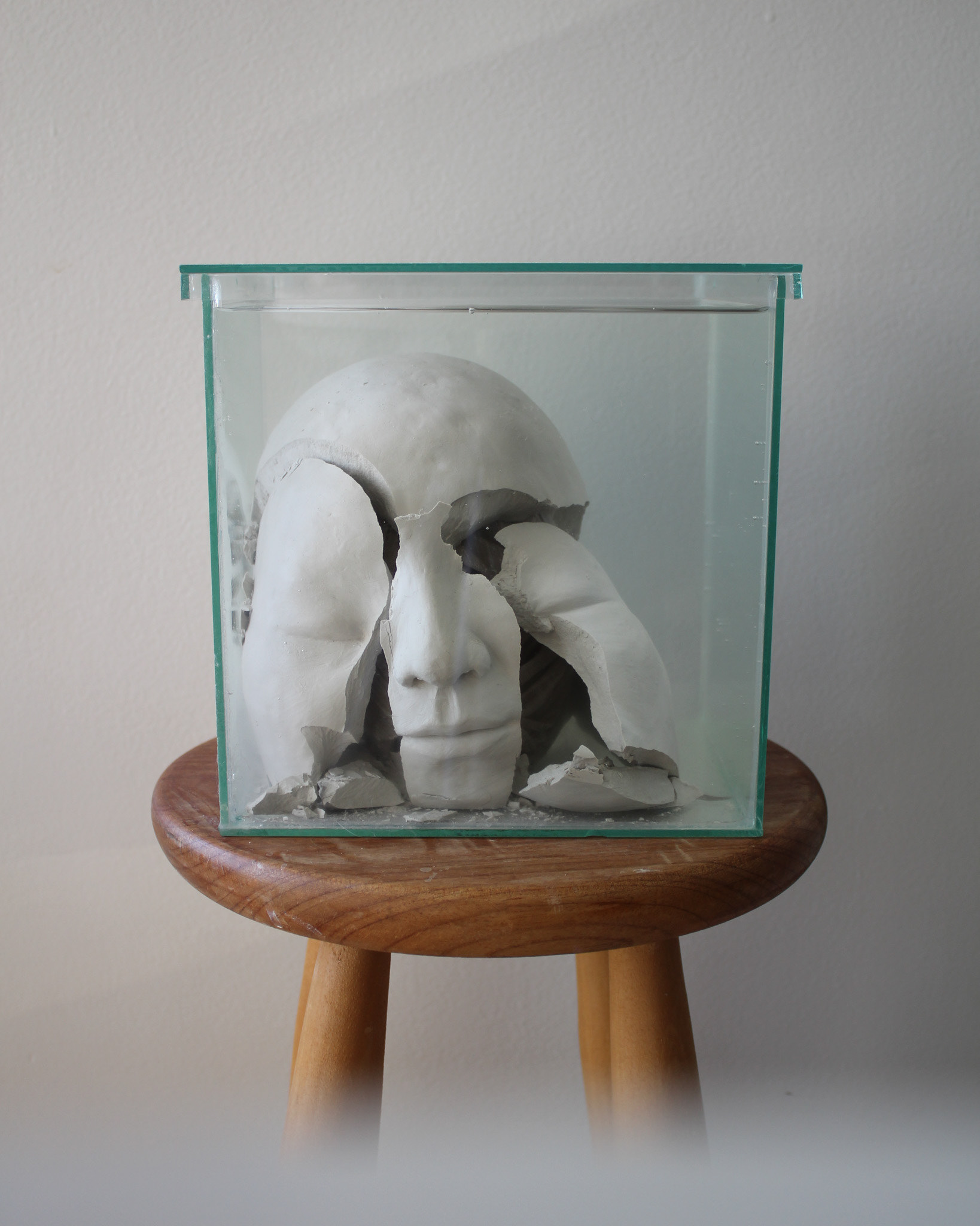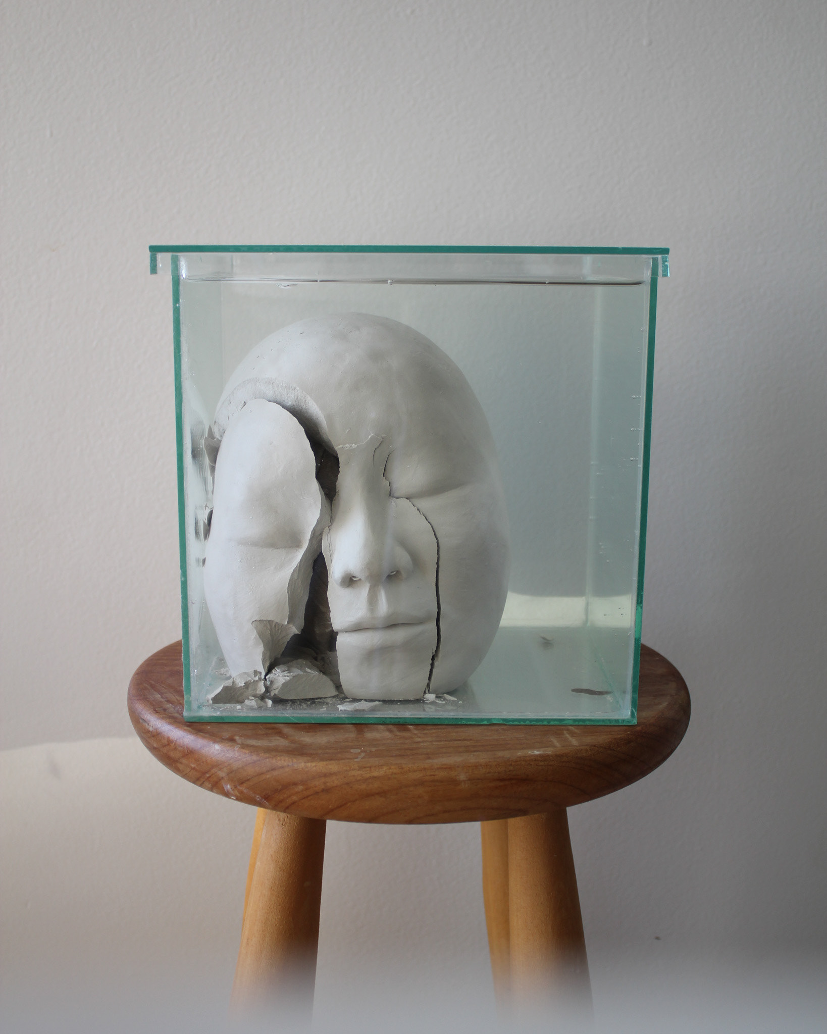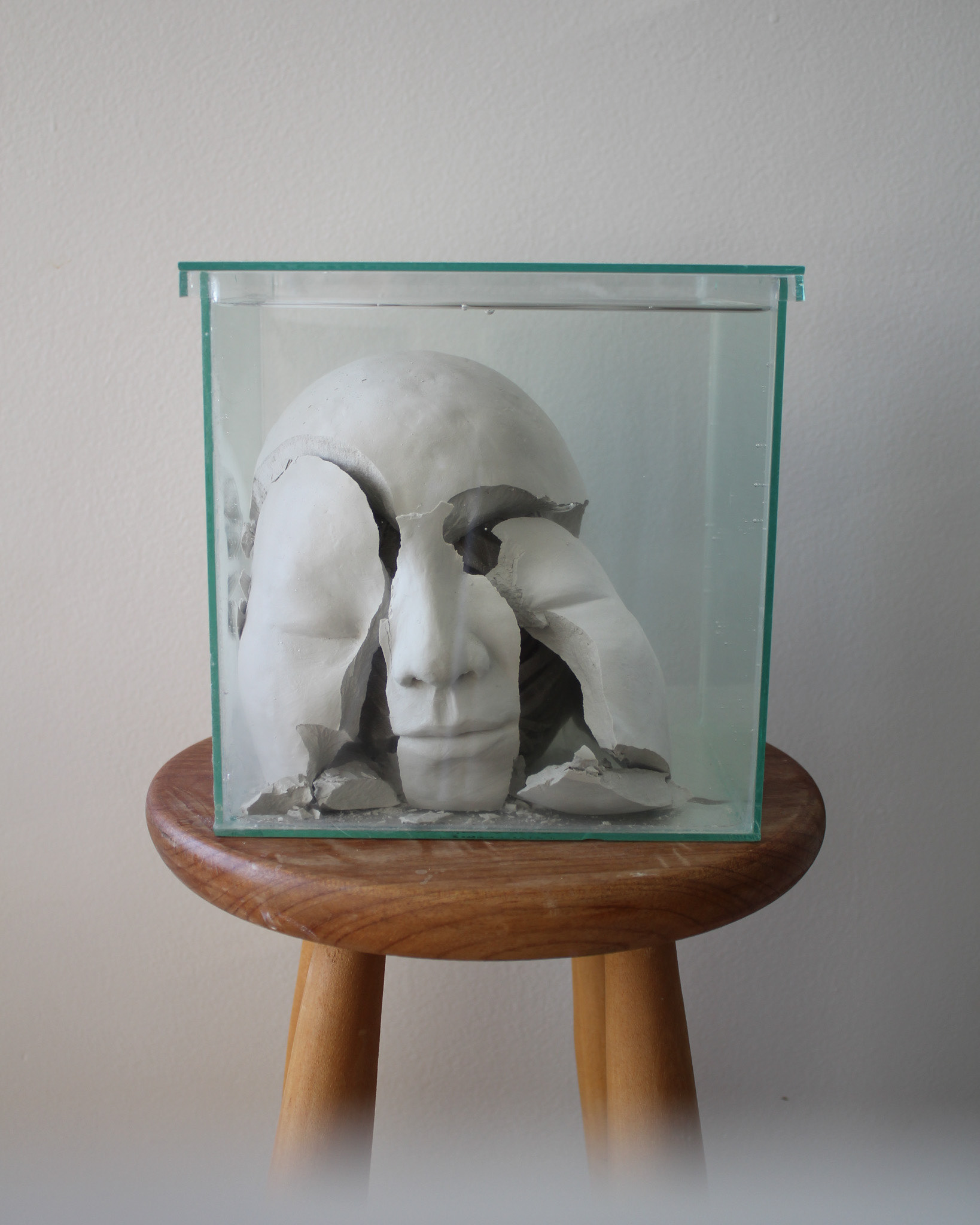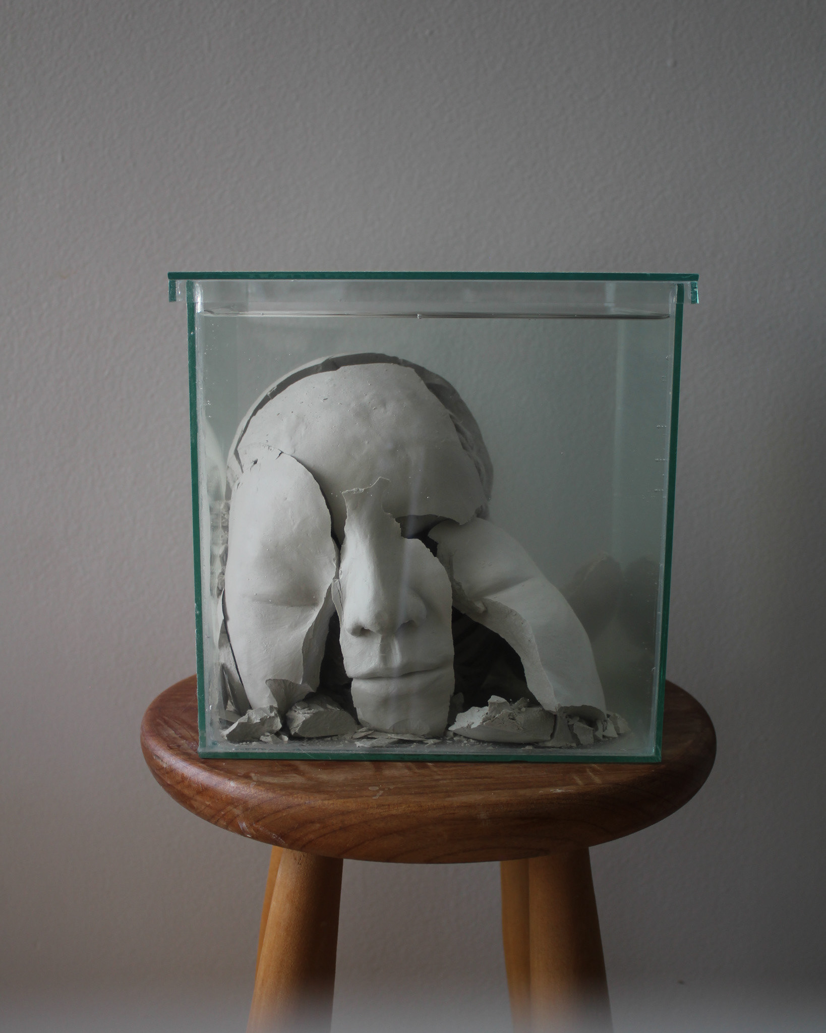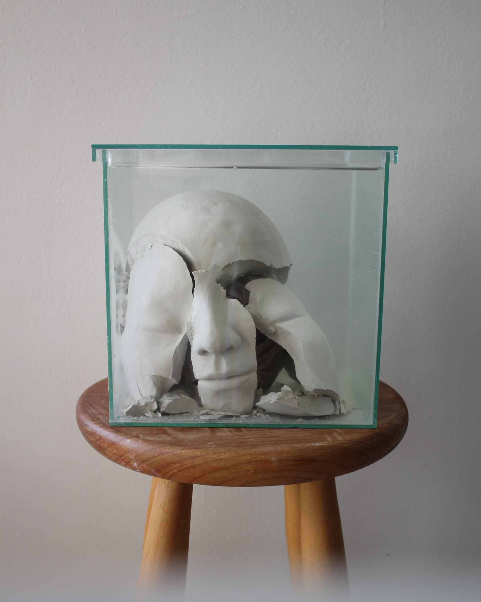 Série de fotografias realizada com registro de escultura de porcelana dissolvida em água. Caixa de vidro utilizada como recipiente. Impressão sobre canvas, 110 cm, 62 cm