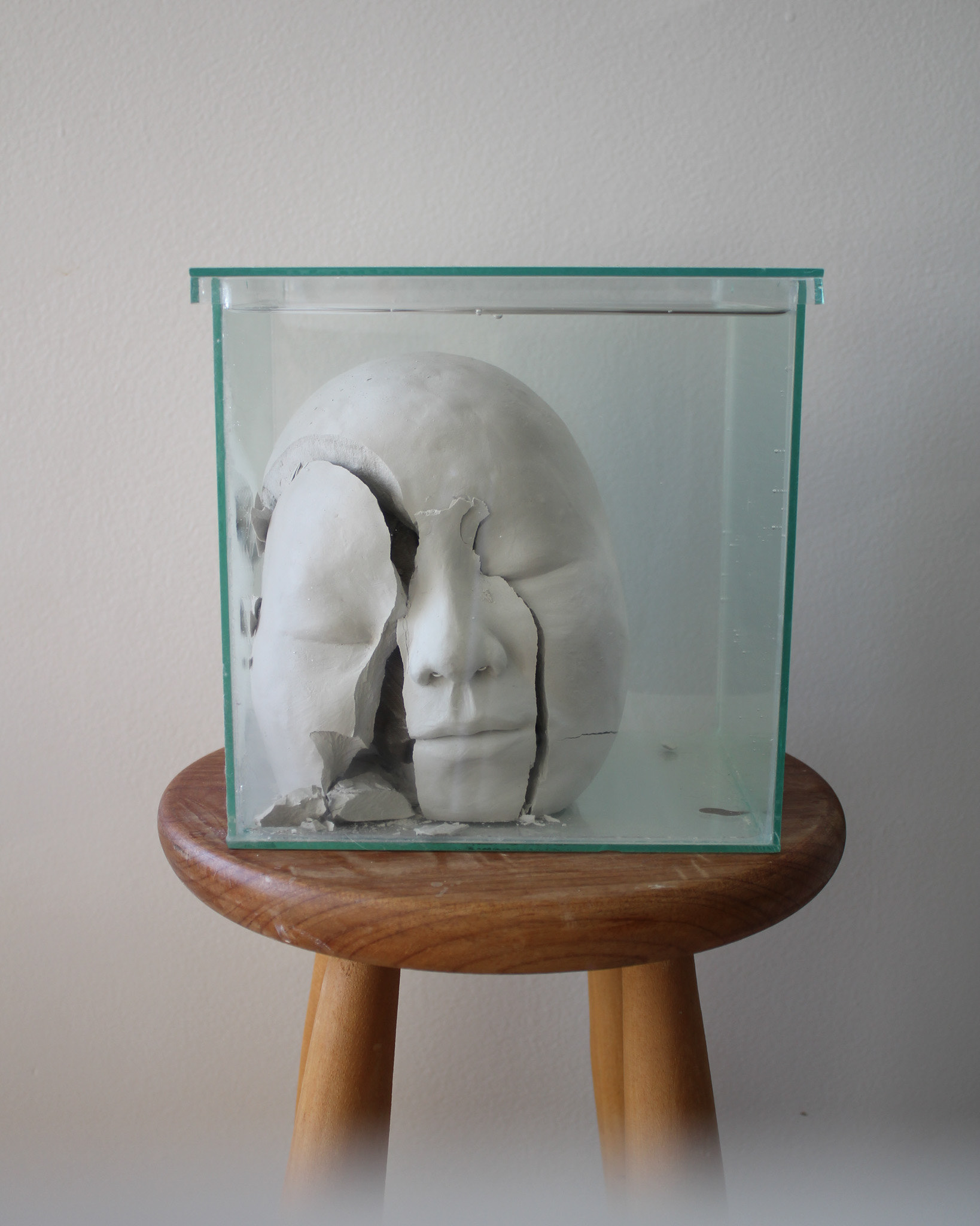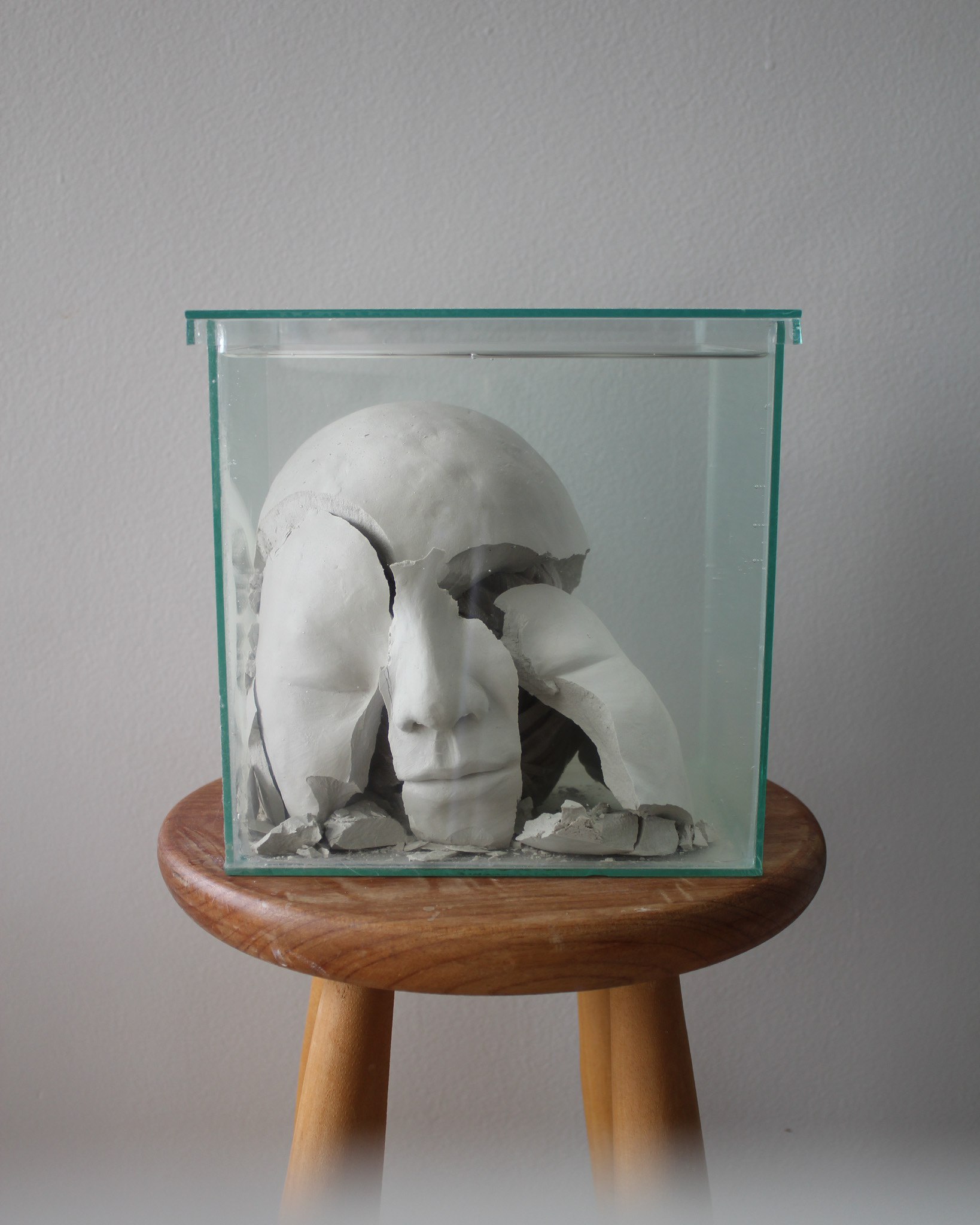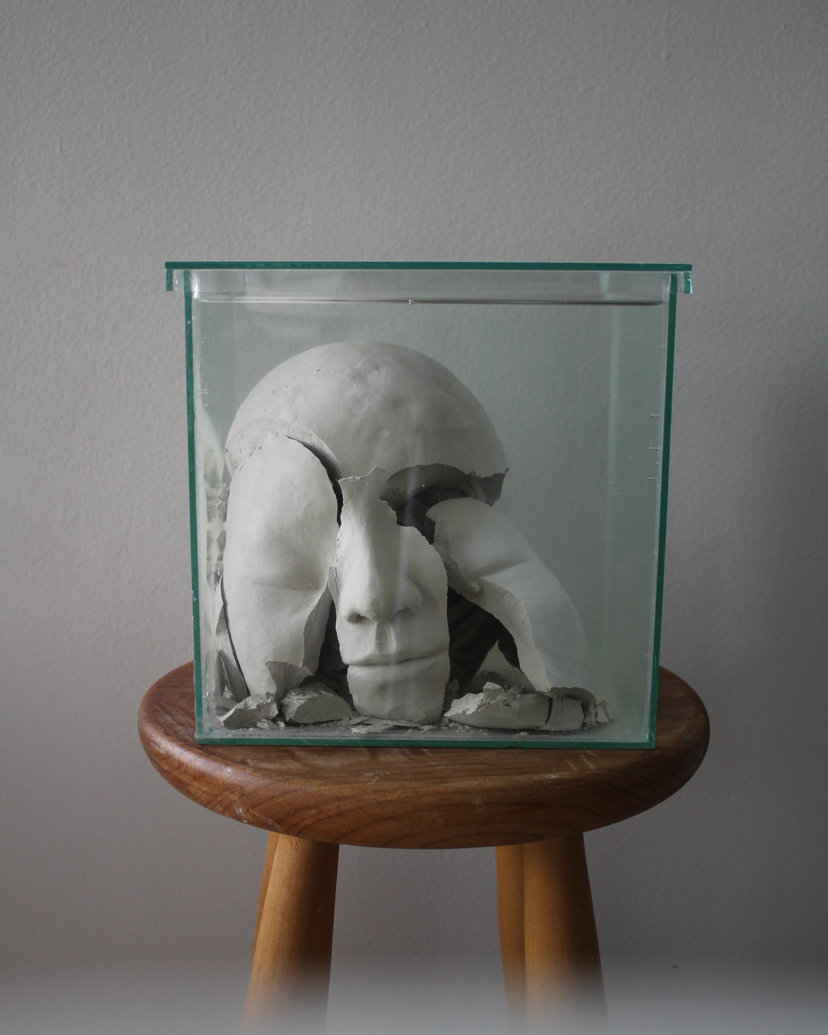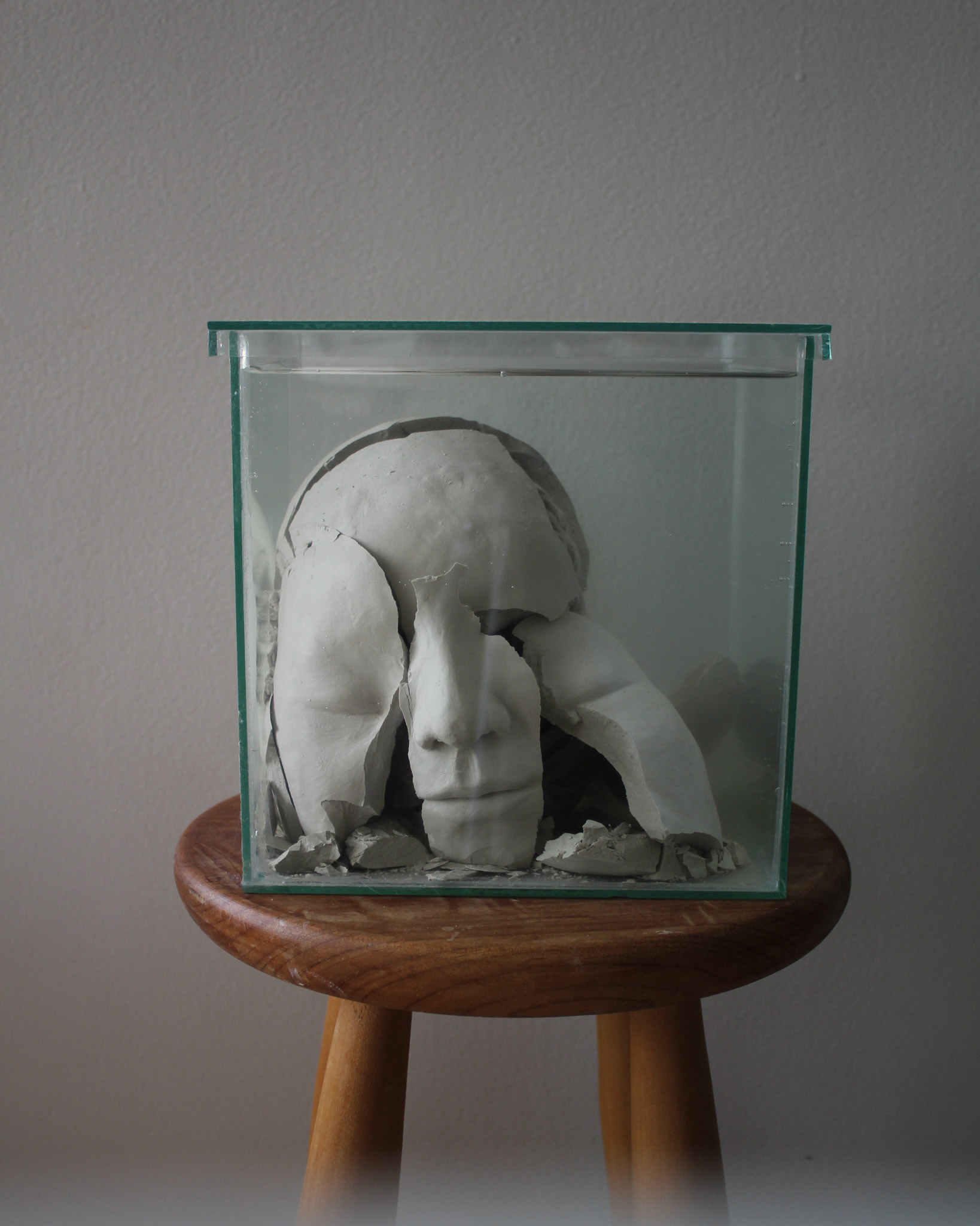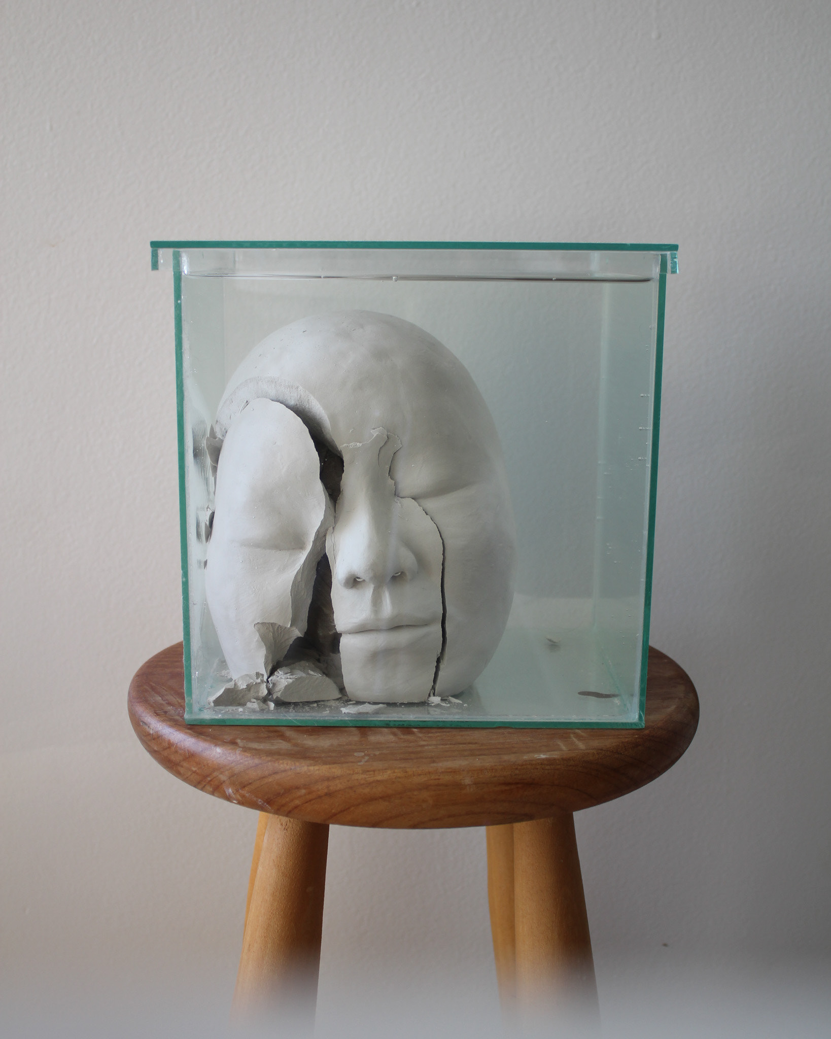 Série de fotografias realizada com registro de escultura de porcelana dissolvida em água. Caixa de vidro utilizada como recipiente. Impressão sobre canvas, 110 cm, 62 cm