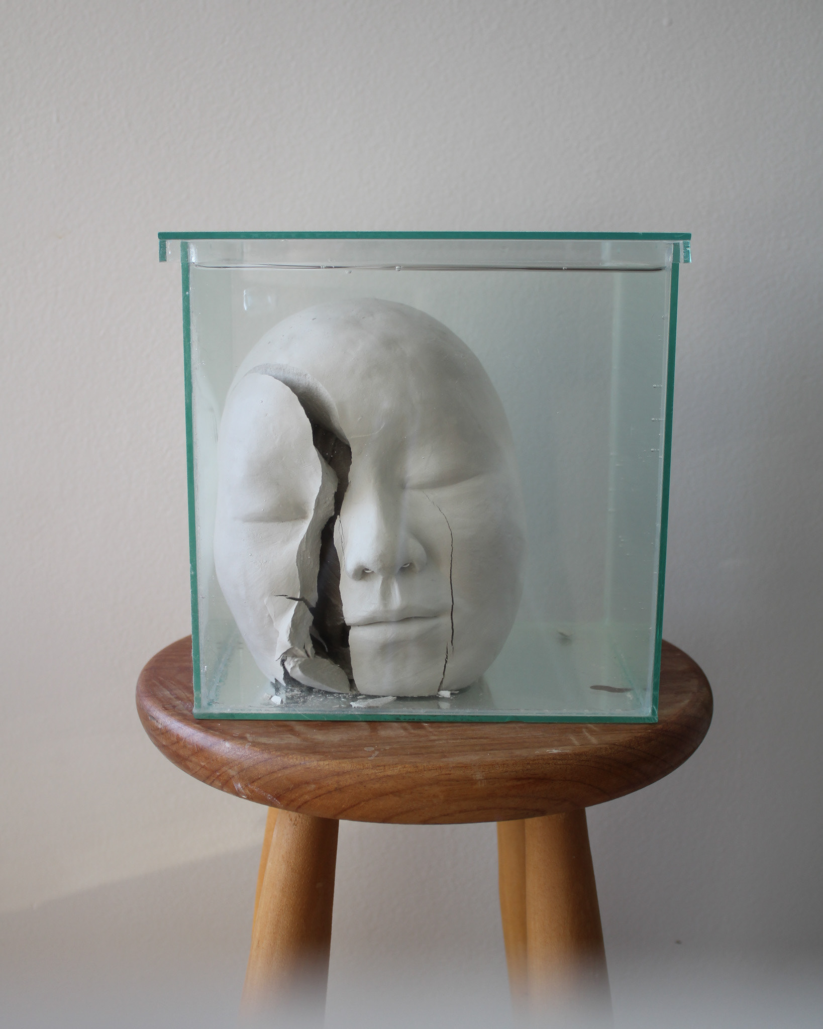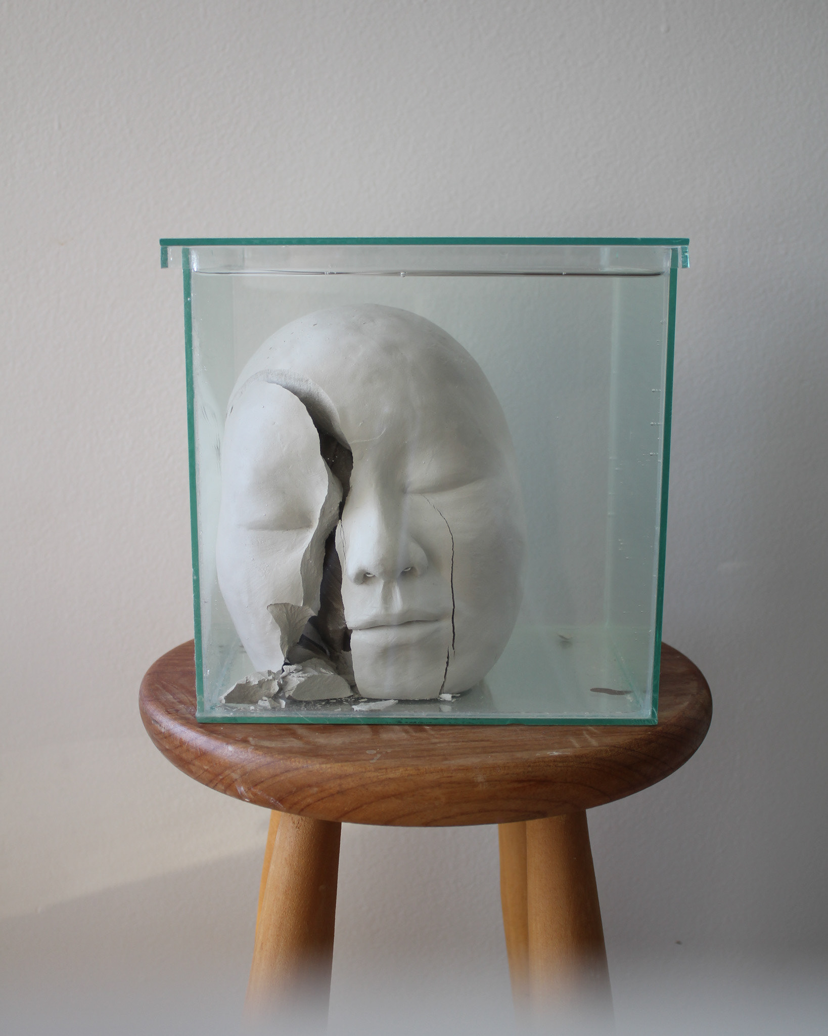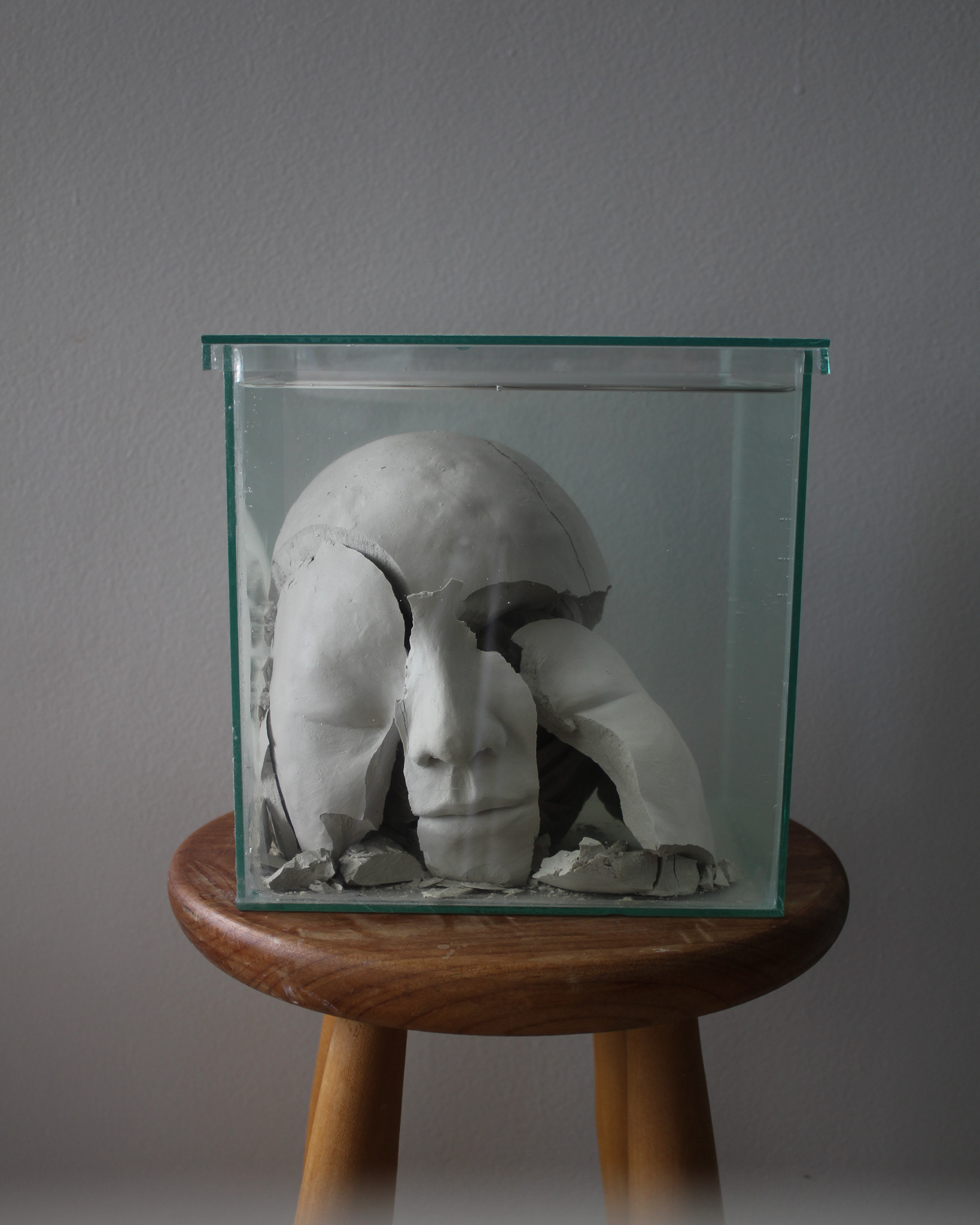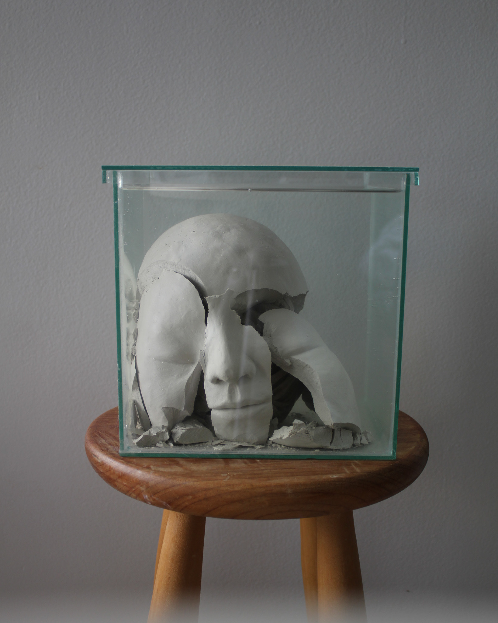 Série de fotografias realizada com registro de escultura de porcelana dissolvida em água. Caixa de vidro utilizada como recipiente. Impressão sobre canvas, 110 cm, 62 cm