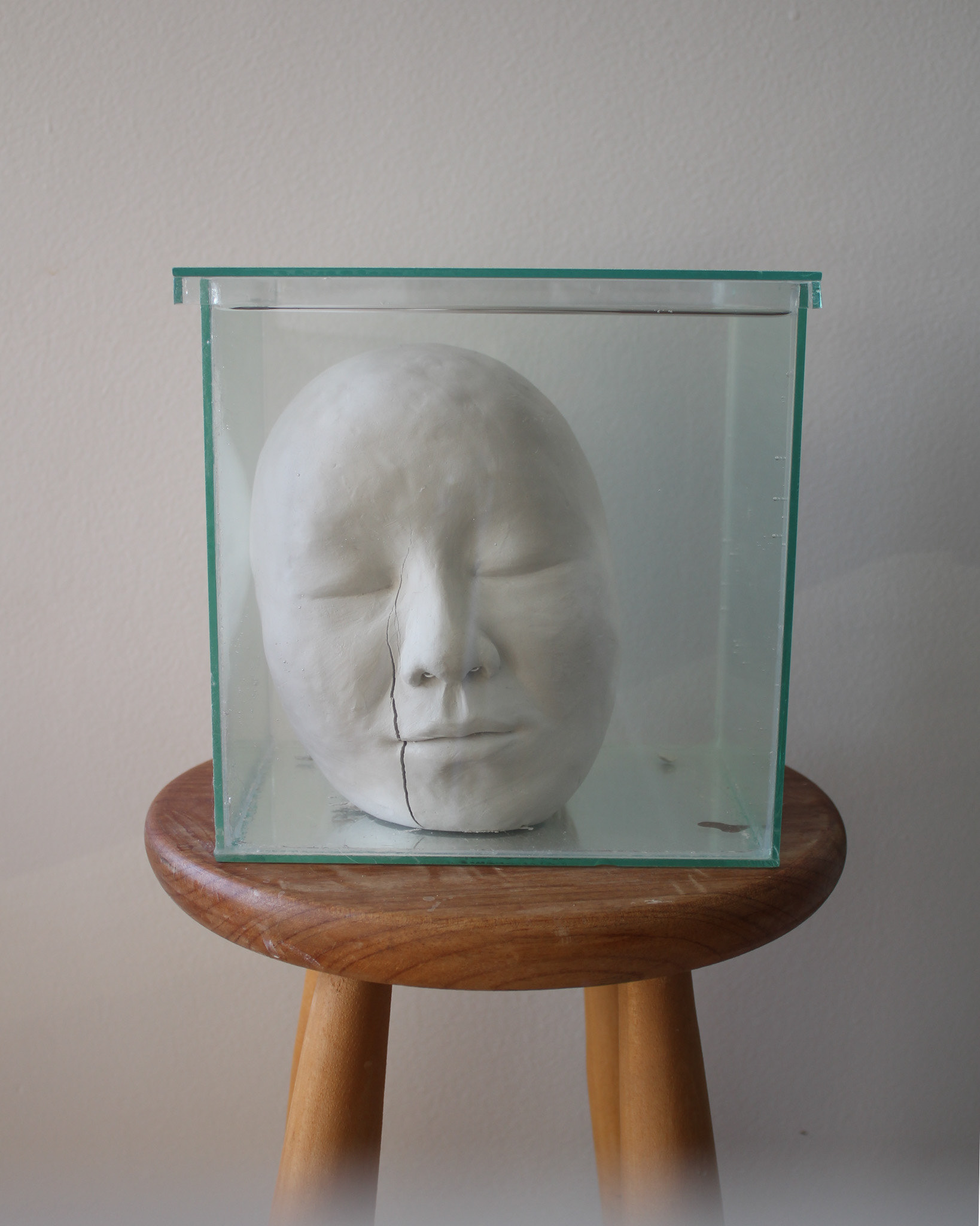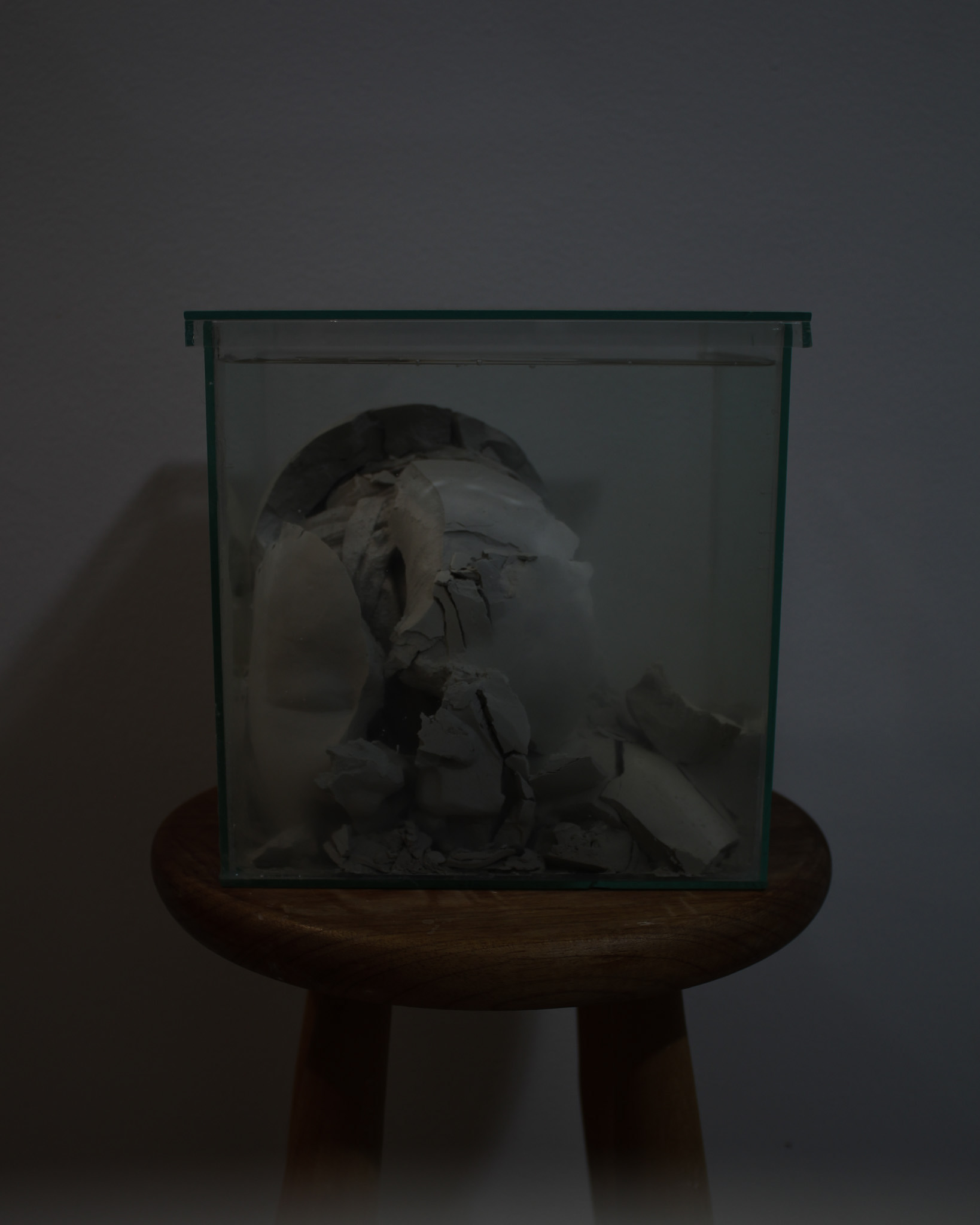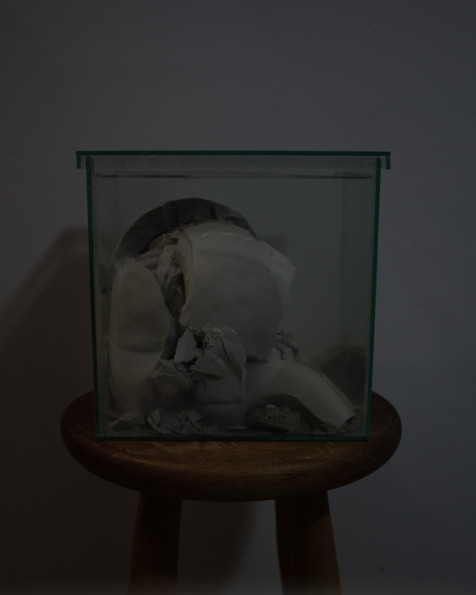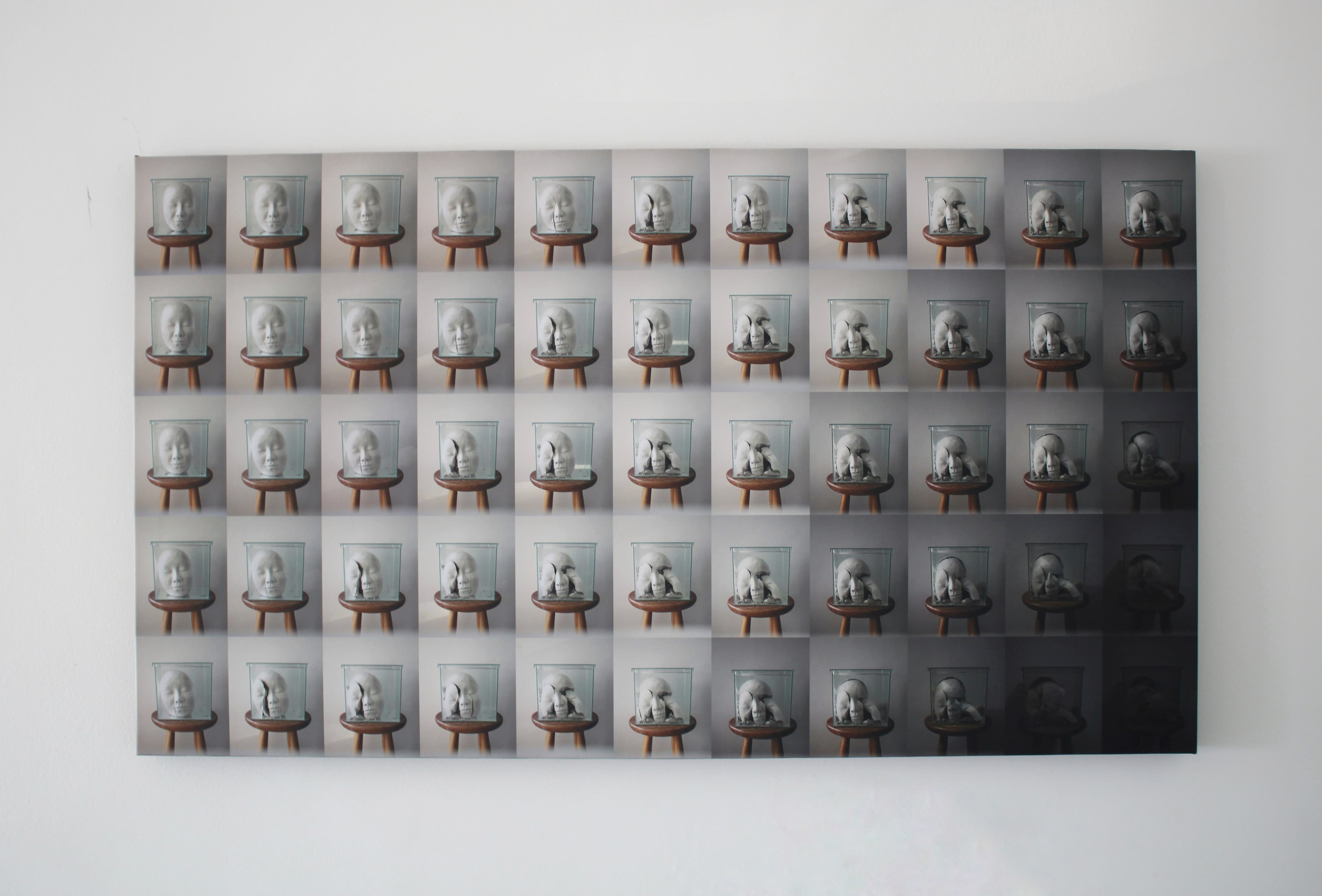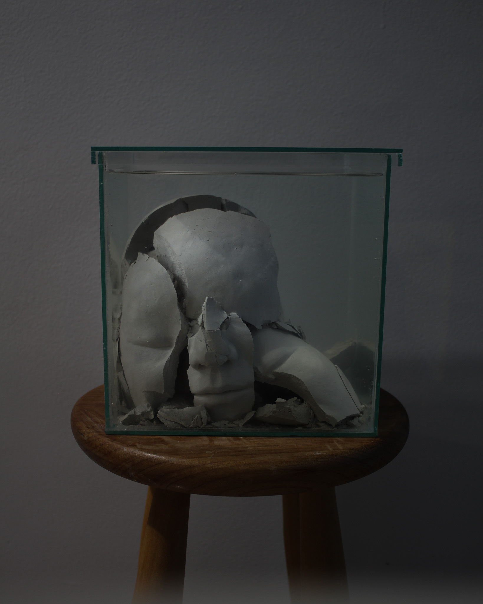 Série de fotografias realizada com registro de escultura de porcelana dissolvida em água. Caixa de vidro utilizada como recipiente. Impressão sobre canvas, 110 cm, 62 cm