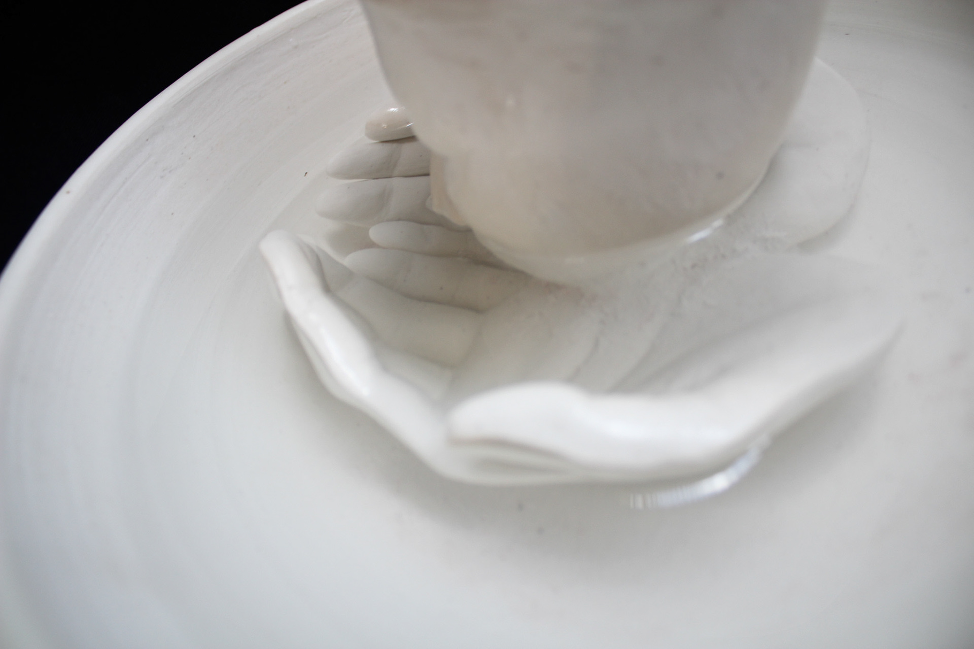 ...também pode a cura. Porcelana, esmalte transparente e massa plástica. Queima a 1245ºC em forno elétrico. Dimensões: 32 cm, 30 cm, 30 cm.